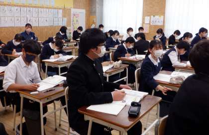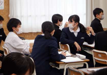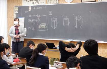 3−Cの数学の授業風景です。「立体積体積を求めよう」という課題で学習をしています。分からないところは、近くの生徒同士で教え合って理解を深めています。いいぞ、1年生!