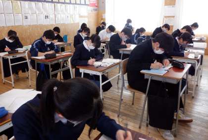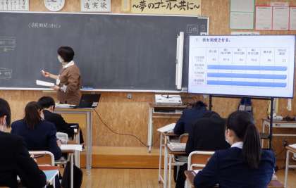 2−Aの数学の授業風景です。「データの活用」の単元は、新たに加わった学習内容です。データを分析して活用する能力は、これから必要とされます。生徒は、集中して学習に臨んでいます。