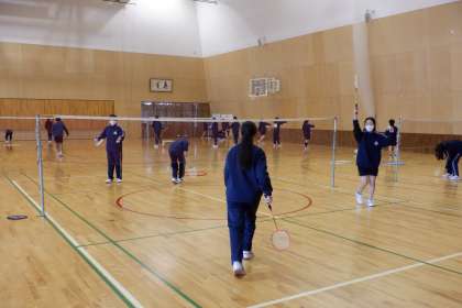 3月8日(水) 2限 1−Bの体育の授業風景です。バドミントンをしています。