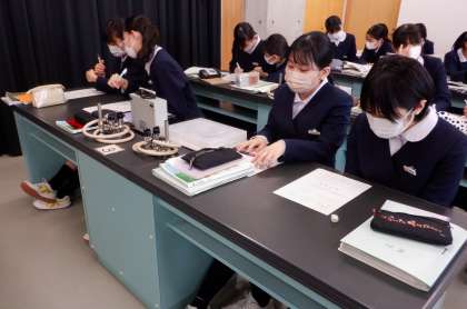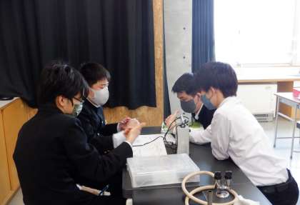 2−Bの理科の授業風景です。「磁界」について、まずはプリントで振り返りをしています。分からないところは相談をしています。