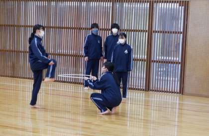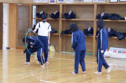 フラフープに触れないで、フラフープをすり抜けることができるか・・・.柔軟性も必要ですね。