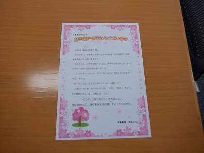本日の給食に際して、栄養教諭から次のようなメッセージが各教室に届けられました。