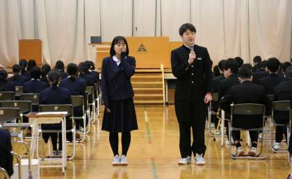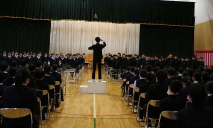 想いを繋ぐ合唱 公開日 2023/03/14 更新日 2023/03/14 芝園の一日 3月14日(火) 卒業式当日、在校生は、会場ではなく教室でオンラインで参加します。 そのため、3年生の生の歌声を聞くことができません。本日の式の練習の後に、3年生から後輩に向けて想いを伝える合唱を披露しました。 3年生が後輩に向けて「一人一人ができること、精一杯がんばってほしい。そして、芝園中頼んだ頼んだ」というメッセージを後輩に託し歌声を届けました。