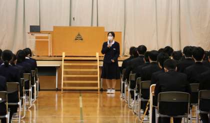 3年生の想いが込められた合唱を、1、2年生は真剣な態度で聞いていました。その後、在校生を代表して生徒会長が「先輩達の想いを受け継ぎ、先輩達のように芝園中学校を引っ張っていきます」と決意を述べました。