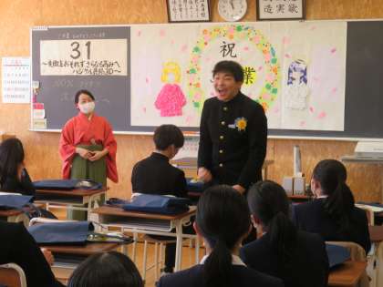 卒業式後の学活 3−D 公開日 2023/03/16 更新日 2023/03/16 芝園の一日 3月16日(木) 3−Dの卒業式後の学活の様子です。 いろいろな困難も、クラス全員で乗り切ってきました。その絆は忘れません。3−Dありがとう!