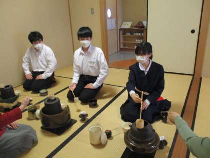 2年生は風炉を使って基本的なこと、3年生は丸卓を使った炉のお点前をしました。