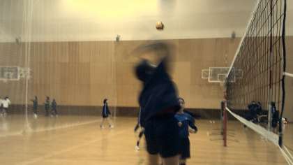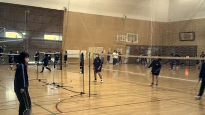 今日の部活動の様子です。体育館には、元気な掛け声が響いています。バレーボール部は、スパイク練習に励んでいました。バドミントン部は、ネットをはさんで試合形式の練習です。