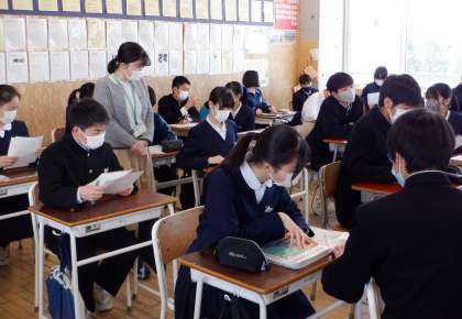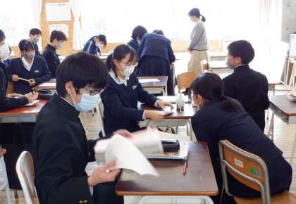 2−Aの英語の授業風景です。今日は最初に、リスニングのテストをしました。テストの後は、どれだけできていたかをお互いに確認しています。今日も2年生は、頑張っています。