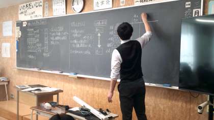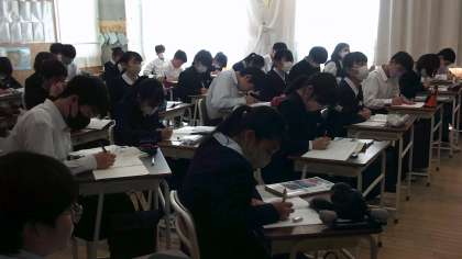 1−Bの理科の授業風景です。地層について学習しています。長い年月をかけて走のように積もった地層から、どのような現象が起こったかを考えながら理解を深めました。