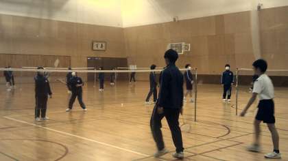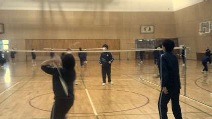 2−Cの体育の授業風景です。バドミントンをしました。ネットをはさんで、白熱したラリーが続いていました。スマッシュが決まった瞬間は、チームメイトと喜びを分かち合いました。