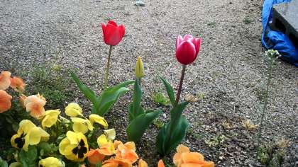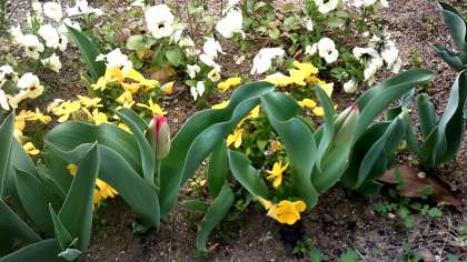 学校の花壇に植えられたチューリップが咲き始めました。今日は、少し風が冷たくて、空は曇っていますが、植物たちは、春に向けて一生懸命に花を咲かせようとしています。もうそこまで、春が来ていますね。