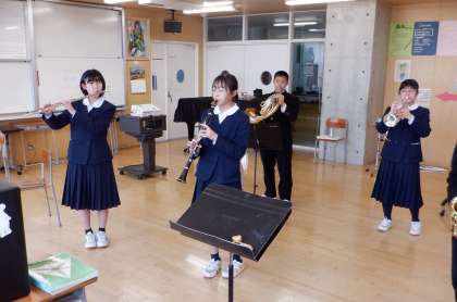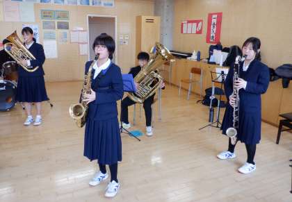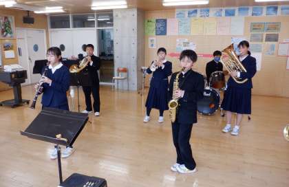 部活動頑張っています その4 公開日 2023/04/05 更新日 2023/04/05 芝園の一日 4月5日(水) 14:00 吹奏楽部の活動の様子です。部活動紹介で行う演奏の練習をしていました。新入生のみなさん、楽しみにしてくださいね。