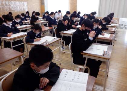 今日は中教研学力調査の1日目です。1年生の時に学習した内容が、どれだけ理解できているか・・・。