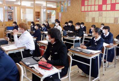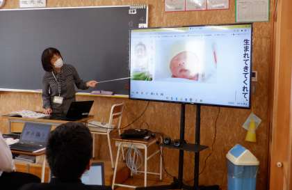 3−Bの家庭科の授業風景です。3年生では、保育分野の学習をします。今日は「生まれてきてくれて、ありがとう」という教材で学習を進めていました。生徒は、先生の話に真剣に耳を傾けています。