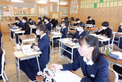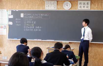 3−Cの社会の授業風景です。「明治時代の文化」について学習をしています。明治を代表する作曲家の滝廉太郎。富山に住んでいたこと、知っていましたか?