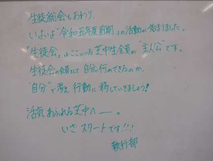 生徒総会を終えて 公開日 2023/04/28 更新日 2023/04/28 芝園の一日 4月28日(金) 生徒会執行部の掲示板に、以下のメッセージが書かれていました。 全員が主人公の芝中生徒会。 これからの活動が楽しみです!