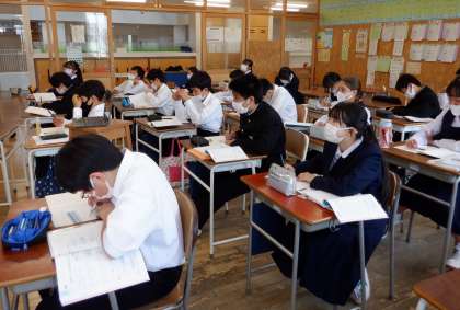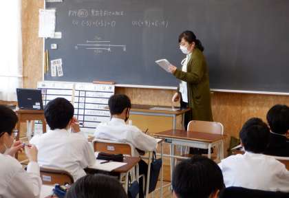 1−Cの数学の授業風景です。1年生の数学は、1クラスを2つに分けて少人数での学習を行います。一人一人に目が届くよう、きめ細かな授業を実施します。