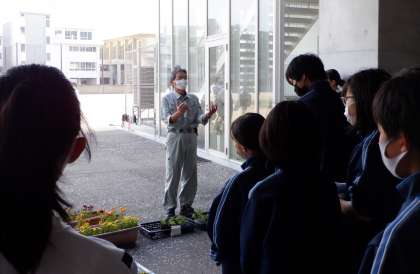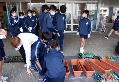 生徒は用務員さんの指示を聞いて、丁寧に植え付けています。