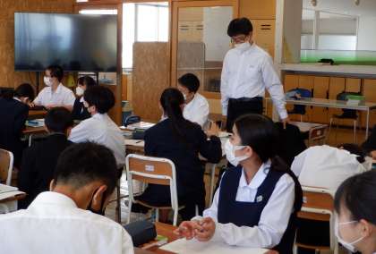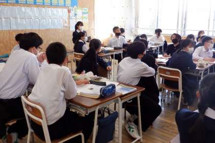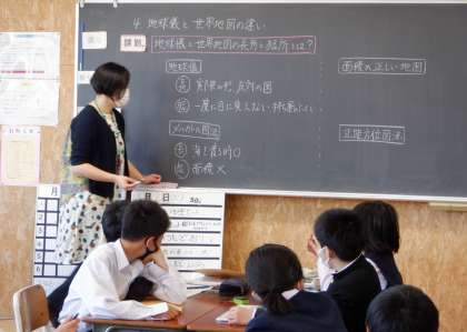 地球儀のよさは 1−B社会 公開日 2023/05/02 更新日 2023/05/02 芝園の一日 5月2日(火) 1限 1−Bの社会の授業風景です。「地球儀にはどんなよさがあるか」について、グループで話し合って発表しています。