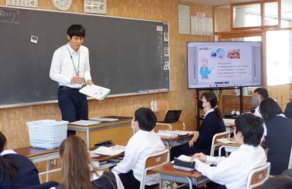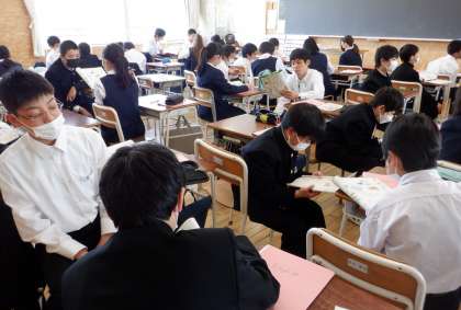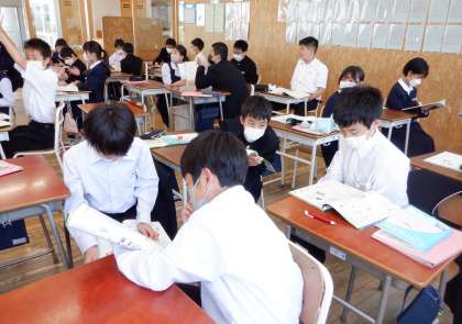1−Aの英語の授業風景です。ペアで、本文を読む連取をしています。ペアで学習をすると、集中力も高まっています。