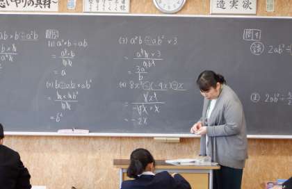 2−Bの数学の授業風景です。単項式の計算問題にチャレンジしています。今日は2人の教員で授業をしています。疑問に思うことがあれば、どんどん質問しましょうね!