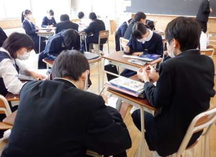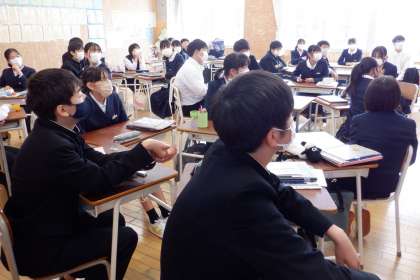 ALTの先生と活動 3−A英語 公開日 2023/05/08 更新日 2023/05/08 芝園の一日 5月8日(月) 2限 3−Aの英語の授業風景です。今日はALTの先生との授業です。グループで相談しながら、現在完了形の英文を考えています。