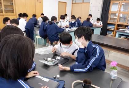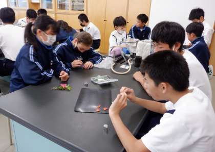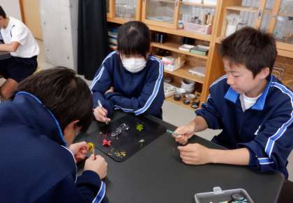 1−Aの理科の授業風景です。今日は「花を分解して、つくりを調べよう」という課題で授業をしました。ピンセットやルーペを片手に、慎重に調査しています。