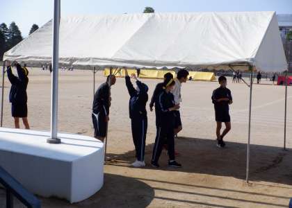 朝早くから実行委員や団リーダーが集まって、テントの準備をしてくれています。学年練習や団活動がスムーズ行えるようにと、よく働いてくれます。