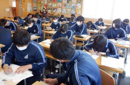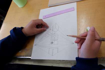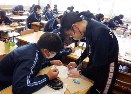 3−Aの美術の授業風景です。「二点透視図法」を使って、デザインの練習をしています。うまくできたかな?