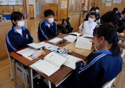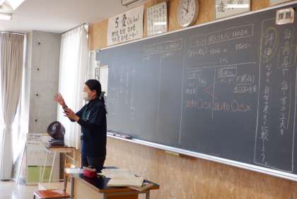 3−Cの国語の授業風景です。「握手」の教材で学習をしています。今日は「ルロイ先生の生き方にあこがれるか」という問いに、「あこがれる」「あこがれない」に分かれてディベートをします。じっくり考えています。