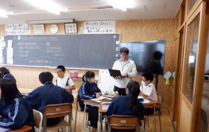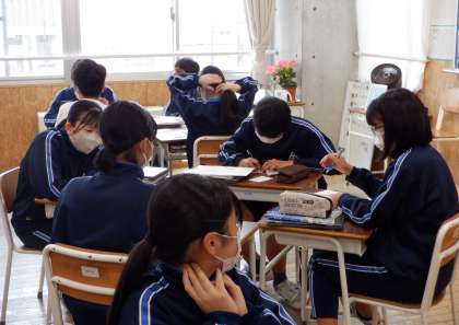 2−Cの技術の授業風景です。日本の農業の問題点を挙げ、どのように改善していけばよいかを個人、そしてグループで討議しています。答えのない課題について、生徒は自分事として考えて、議論しています。