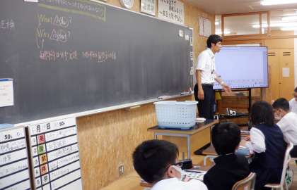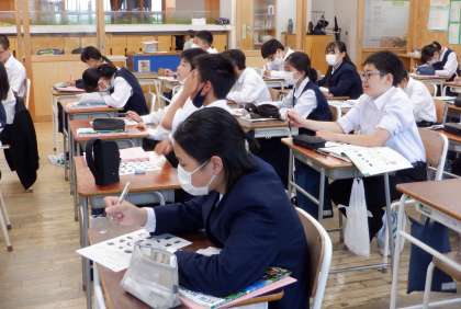 画像は1−Bの英語の授業風景です。「疑問詞」を使った疑問文について学習をしています。基礎となる大事な授業。生徒は、集中しています!