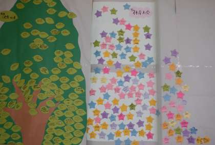 2学年のフロアです。「Bright Stars Project」として一人一人の「輝き」を掲示してあります。体育大会が終わって、みんなが見つけた一人一人の「よさ」。星となって輝いています。