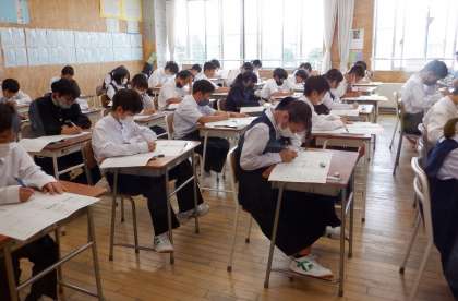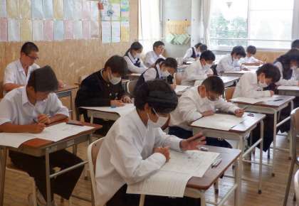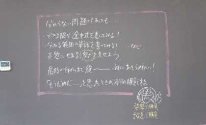 初めての定期考査。力を発揮できたかな?黒板には担任からの励ましのメッセージが書かれています!