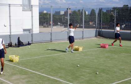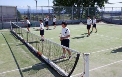男子ソフトテニス部の活動の様子です。今日は芝生のコートで活動をしました。ナイスボレー!