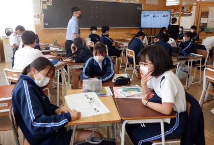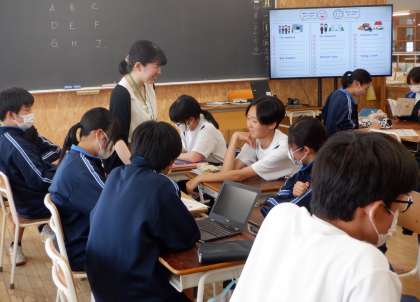 3−Cの英語の授業風景です。makeを使って「〜を〜にする」という表現を学習しています。グループで話し合うと、自分が考えられなかった表現に気づきます。