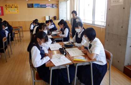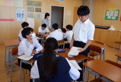 2−Bの音楽の授業風景です。「翼をください」の曲について学習をしています。曲の特徴を捉えて、どのように表現したらよいか。グループで考えを伝え合って、深めています。