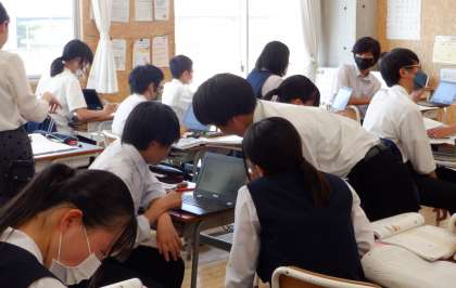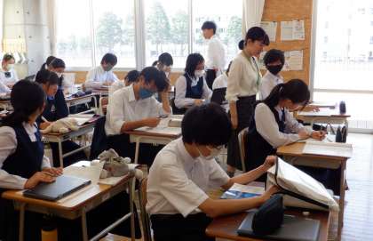 3−Dの英語の授業風景です。「自分の推しへ、手紙を書こう」という課題に取り組んでいます。誰に手紙を書こうか?楽しんで考えています。