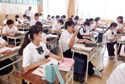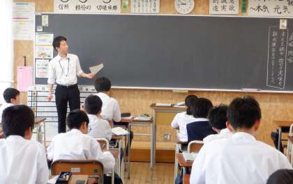 1−Aの国語の授業風景です。「比喩で広がる言葉の世界」という教材の学習をしています。説明的文章では、新出漢字や語句の意味を理解することが大事です。