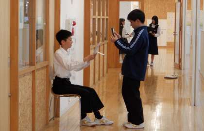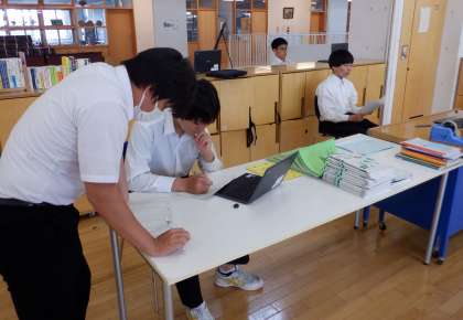 3−Bの国語の授業風景です。生徒は今日もいろいろな場所で、考えを深めたり、実際に伝える練習をしたり、主体的に学びを深めています。