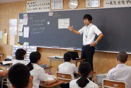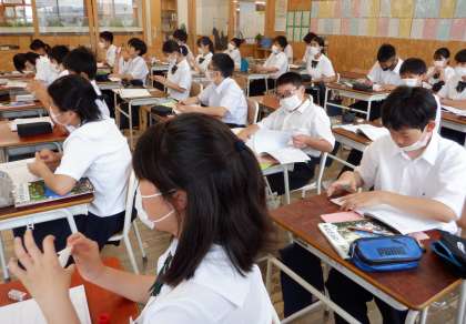 画像は、1−Bの英語の授業風景です。先生と一緒に発音練習をした後、ノートの整理をしました。