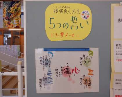 5つの誓い 公開日 2023/06/15 更新日 2023/06/15 芝園の一日 6月15日(木) 12日に行った腰塚勇人先生の講演会後、校内のいろいろなところに「5つの誓い」が掲示してあります。 いつも胸にとめておきたい言葉です。