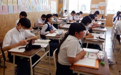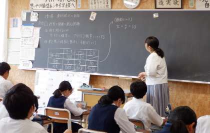 2−Cの数学の授業風景です。「連立方程式の利用」について学習をしています。難しいと思われがちな単元ですが、生徒は意欲的に問題に取り組んでいます。