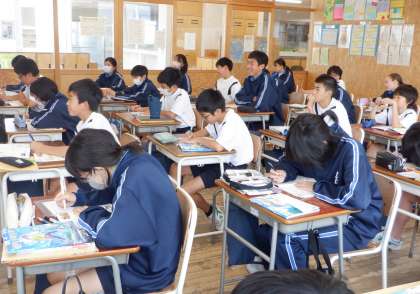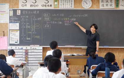 1−Aの保健の授業風景です。「食生活と健康」という課題で学習をしています。朝ご飯を食べると、どんな利点があるか・・・。生徒は自分事として考えを深めています。