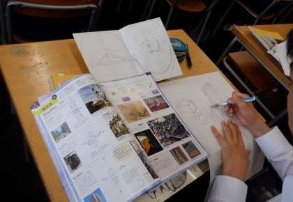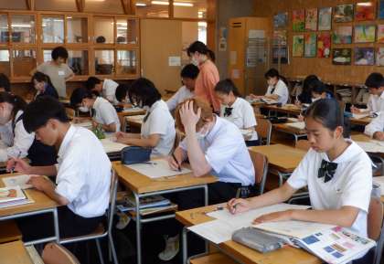 デザイン頑張っています 3−B美術 公開日 2023/06/23 更新日 2023/06/23 芝園の一日 6月23日(金) 3限 3−Bの美術の授業風景です。どんなデザインを取り入れてパネルを制作するか。生徒は考えを巡らせています。