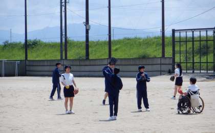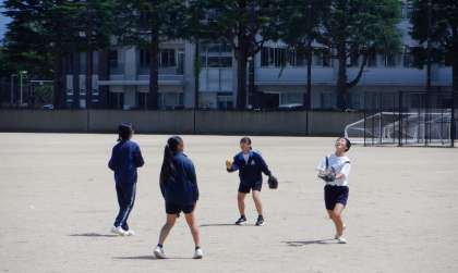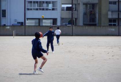 3−Cの体育の授業風景です。ソフトボールの学習をしています。まずは、キャッチボールから。声をかけ合って、楽しく活動しています。
