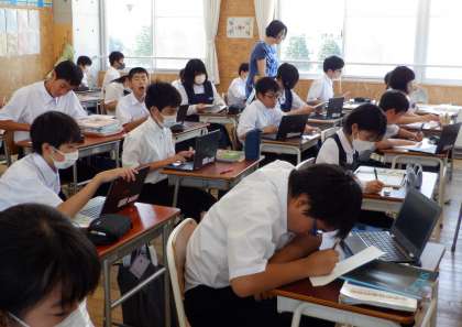 1−Aの社会の授業風景です。今日は、期末考査に向けて各自がそれぞれの課題に取り組んでいます。中には、端末を利用して対策プリントを学習している生徒もいました。