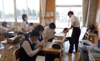 3−Dの技術の授業風景です。「動きを伝達する仕組み」としてリンク装置のやカム装置などを学習しています。実際に模型を作って、動きを確かめています。