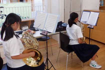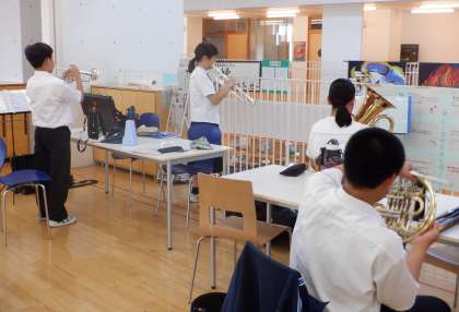 画像は、吹奏楽部の活動の様子です。基礎・基本を大切に練習中。コンクールに向けて頑張っています!