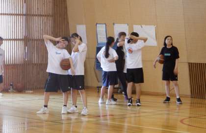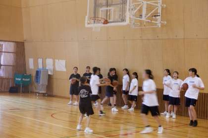 女子バスケットボール部の活動の様子です。カメラに向かってポーズをとってくれる生徒も。とにかく明るい女子バスケットボール部員です!